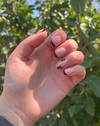Capturing the playful spirit of nature, these short nails feature a classic French tip with a creative twist. A delicate floral design on one finger brings a touch of whimsy, reminiscent of a garden in bloom. This simple yet charming nail art is perfect for those who appreciate a hint of natural beauty in their everyday look.