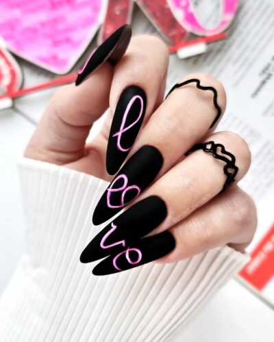 A striking contrast of matte black with a vivid neon pink outline gives these nails a pop of color and a playful twist. The design is modern and can be a DIY project with the right tools, perfect for someone who loves a little edge to their style. These nails are sure to draw attention and are great for a night out or a casual get-together.