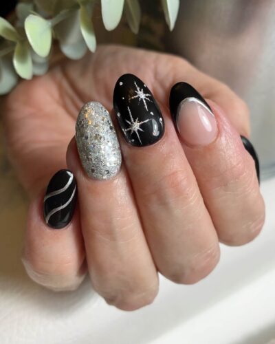 Embrace the allure of the night sky with this manicure that pairs matte black with shimmering silver. The design features a mix of solid, striped, and star-adorned nails, each telling a story of understated elegance. It’s a versatile look that can be achieved at home with matte polish and silver striping tape or by a nail artist for a flawless finish. Suitable for both day-to-day elegance and special occasions, it caters to those who love a modern twist on classic black.