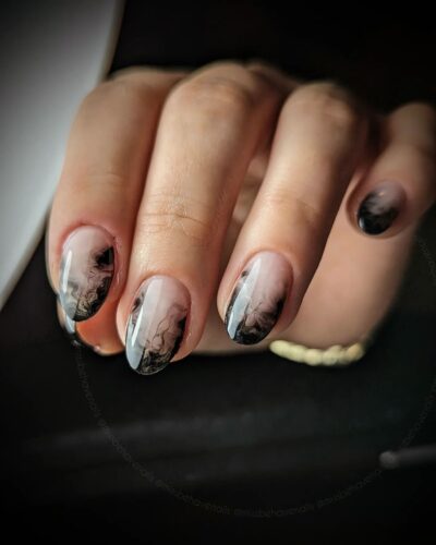 These nails showcase a smoky marble effect that’s both elegant and mysterious. The marbling technique creates a unique pattern on each nail, while the addition of the gold rivet adds a touch of luxury. It’s a sophisticated look that may require some practice or a professional touch, but it’s perfect for those who appreciate a nail design that’s both artistic and stylish.