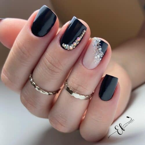 Elevate your manicure game with this black nail design featuring jewel-encrusted statement nails. The glossy black polish serves as a canvas for the sparkling embellishments, making it an ideal choice for gala nights or when you want to feel extra opulent. This intricate look is best achieved with professional assistance for a flawless finish.