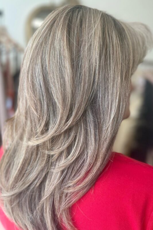 We love this multidimensional grey transitioning look with warmer-toned all-over highlights and neutral lowlights. The strategically placed highlights connect with the new grey growth perfectly, masking them in plain sight. The lowlights, aka the darker shades, add depth and make the highlights pop.