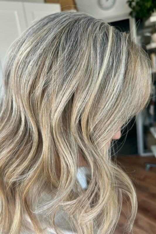 We’re obsessed with this effortless grey balayage on warm blonde hair! The blend of golden highlights and darker lowlights, paired with a perfectly blended shadow root, creates a stunning illusion. As the greys grow naturally, they won’t stand out as much, thanks to the strategically placed hues. This way, you get a beautiful, beaming blonde look while still embracing your natural greys!