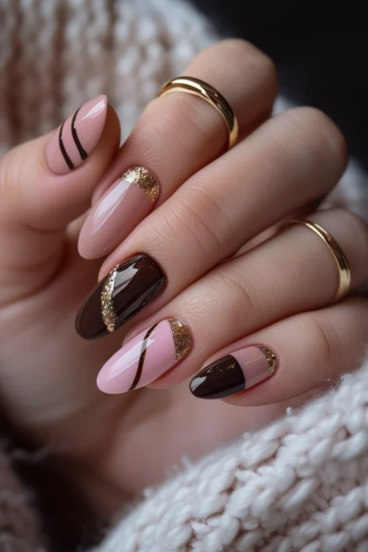 These almond-shaped nails are a feast for the eyes with their harmonious blend of pink and deep brown tones, artfully separated by a sprinkle of gold glitter. They exude an air of elegance and modernity, perfect for any season.